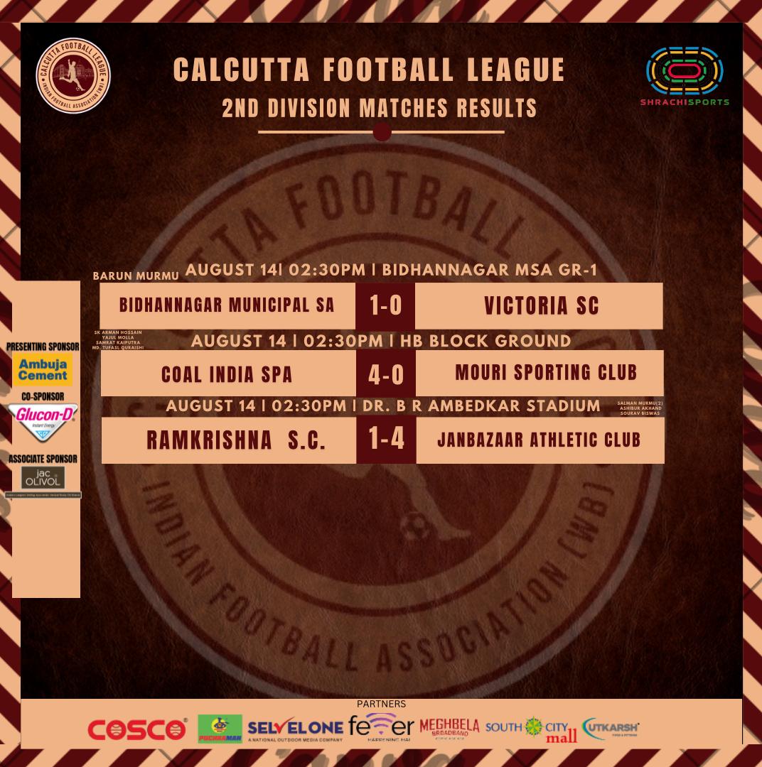 বুধবার কলকাতা ফুটবল লিগের প্রথম ডিভিশনের খেলায় বারাকপুর স্টেডিয়ামে বরিশা স্পোর্টিং ক্লাব ও মহামেডান এসির খেলাটি গোলশূন্য শেষ হয়। দ্বিতীয় ডিভিশনের খেলায় বিধাননগর মিউনিসিপ্যাল স্পোর্টস কমপ্লেক্স বিধাননগর এম এস এ ১-০ গোলে ভিক্টোরিয়া এস সি কে হারায়। গোল করেন বরুণ মুর্মু।এইচ বি মাঠে কোল ইন্ডিয়া এস পি এ ৪-০ গোলে মৌরী স্পোর্টিং কে হারায়। কোল ইন্ডিয়ার পক্ষে আরমান হোসেন,ইয়াজুল মোল্লা, সম্রাট কইপুত্র ও মহম্মদ তাফসাল হাসান গোল করেন। বি আর আম্বেদকর মাঠে জানবাজার এসি ৪-১ গোলে হারালো রামকৃষ্ণ এস সি কে। জানবাজারের হয়ে সালমান মুর্মু দুটি,আশিবুল আখন্দ ও সৌরভ বিশ্বাস গোল করেন।রামকৃষ্ণর গোলটি লব হাঁসদার।